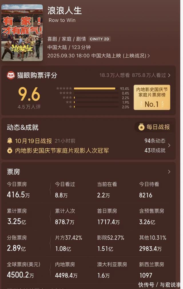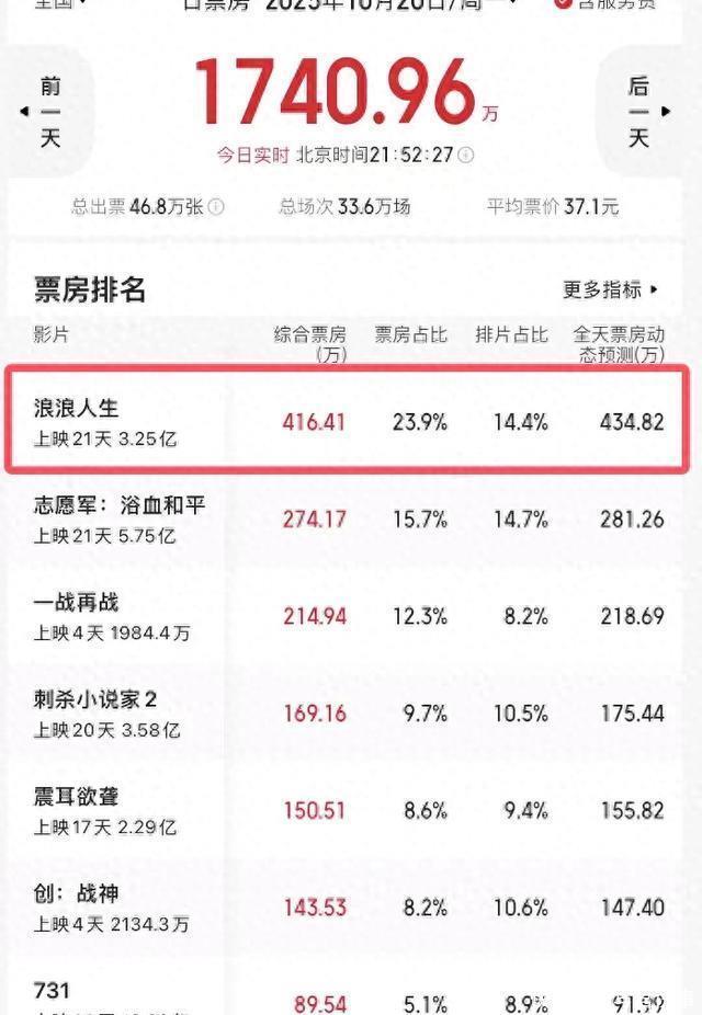 小成本的电影《毕正明的证明》和电影《震耳欲聋》口碑倒是不错,但是剧情片很难撑得起国庆档的排片,因此,哪怕赚了也不多。 不过,今天的票房拿下了冠军的, 竟然是已经上映了21天的《浪浪人生》,这倒是很让人意外啊。 众所周知,电影的口碑发酵现在是越来越快了,好的电影一两天口碑就传出去了,而烂片哪怕是不点映也是捂不住了,一上映必然会露出马脚。 《浪浪人生》属于国庆档上映的一部喜剧片了,很显然,片方对于电影的质量和票房潜力还是有点自信的,在国庆档期开始前就已经开启了点映的模式,整整点了一周,其实就相当于已经“提前抢跑”了。