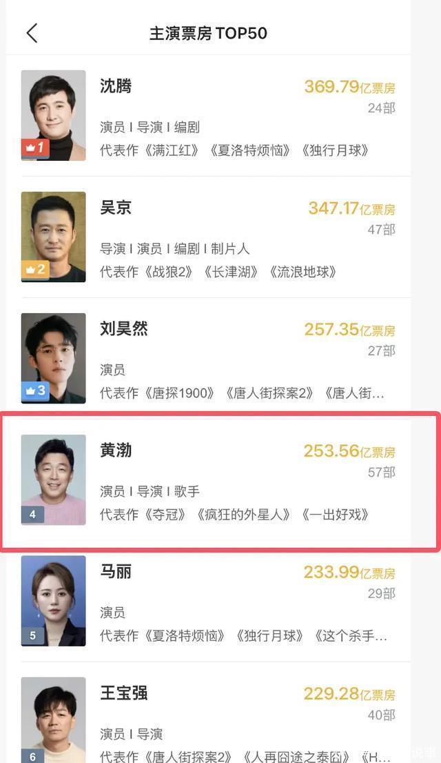 黄渤收到陈佩斯的邀请,就毫不犹豫地答应了。 他出演的大嗓很邋遢,但是很有看点,也让人看到了黄渤不一样的面。 到了《浪浪人生》中,黄渤合作的是范丞丞,两人搭档出演父子。 其实这样的组合大家也屡见不鲜,戏骨搭档小鲜肉,但黄渤的路人缘一直都挺好的,他是百亿影帝,在目前的主演票房榜上, 黄渤排在第四名,仅次于吴京,沈腾等人,也算是现在中生代中的佼佼者了。